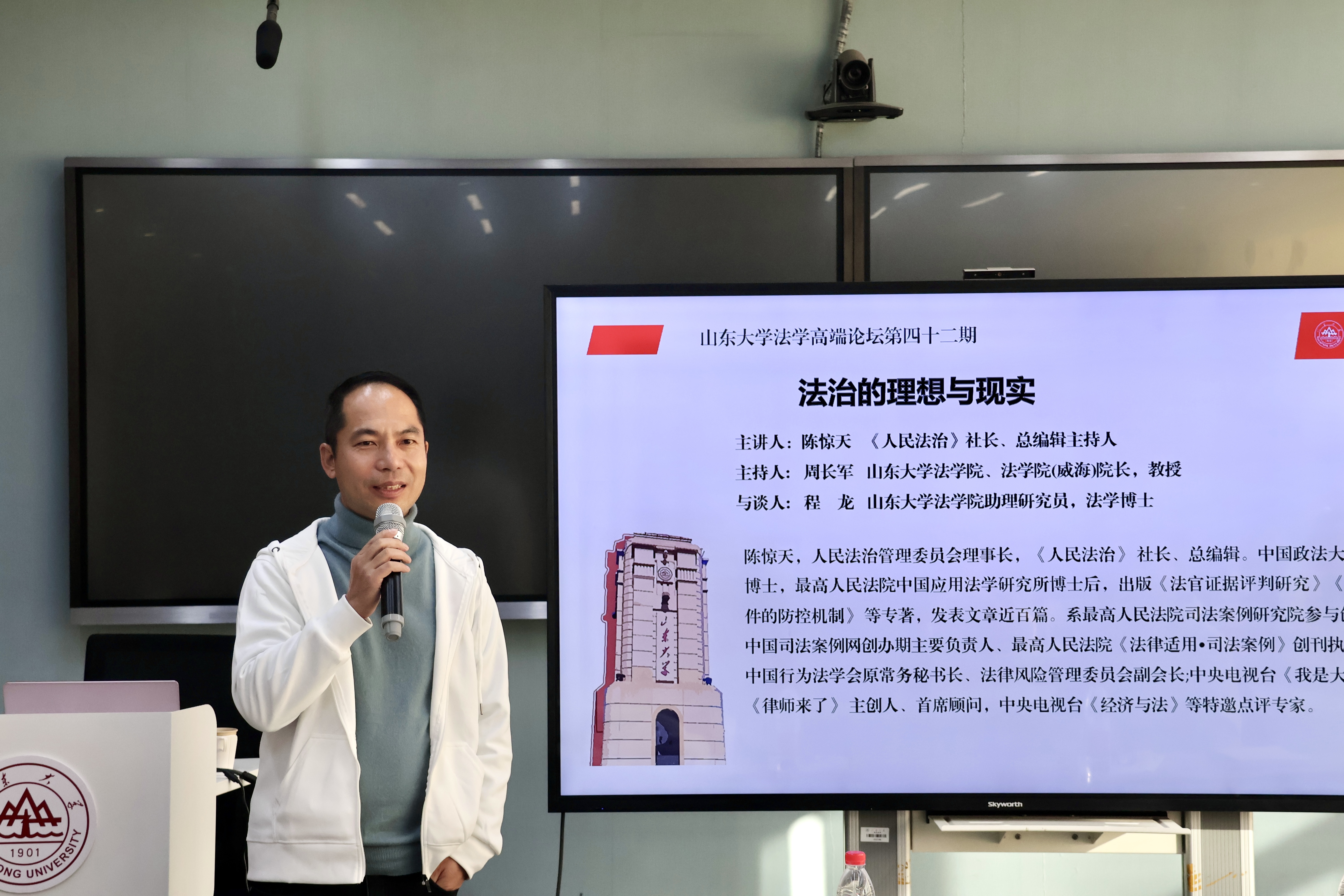 11月14日,555050注册大白菜法学高端论坛第四十二期于青岛校区华岗苑举办。《人民法治》社长、总编辑陈惊天以“法治的理想与现实”为题作学术报告。讲座由2024白菜网址官网大全、2024白菜网址官网大全(威海)院长周长军教授主持,2024白菜网址官网大全程龙助理研究员担任与谈人。