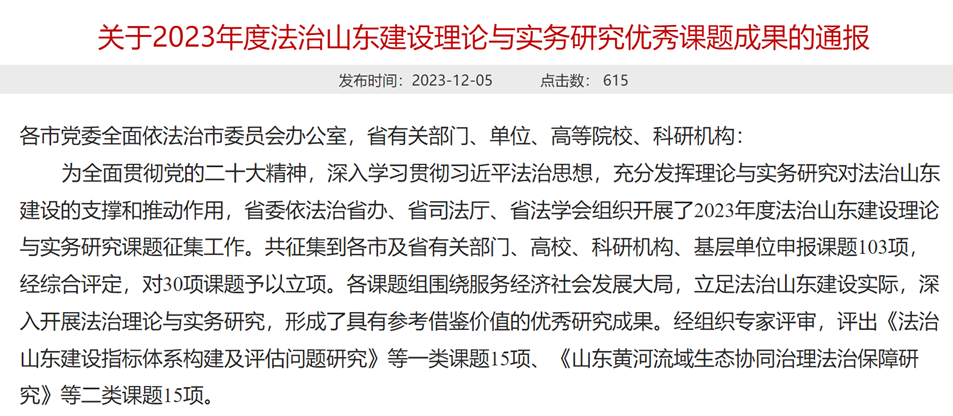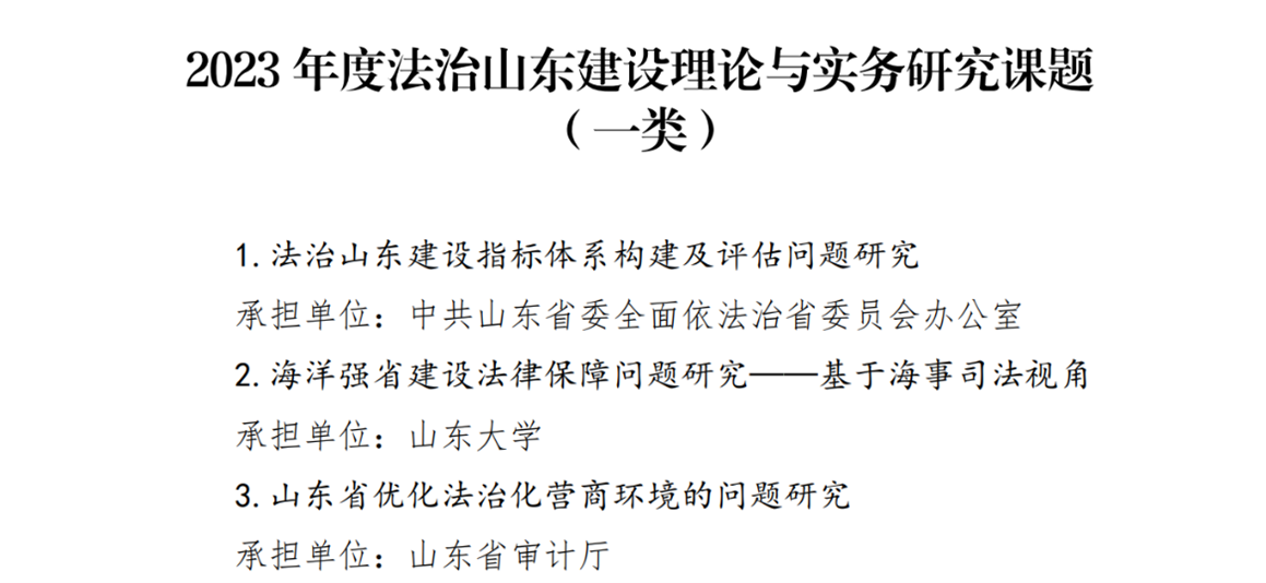 近日,山东省司法厅发布《关于2023年度法治山东建设理论与实务研究优秀课题成果的通报》,由2024白菜网址官网大全司法实务研究中心承担的研究课题“海洋强省建设法律保障问题研究——基于海事司法视角”顺利结项,并被评为一类课题。