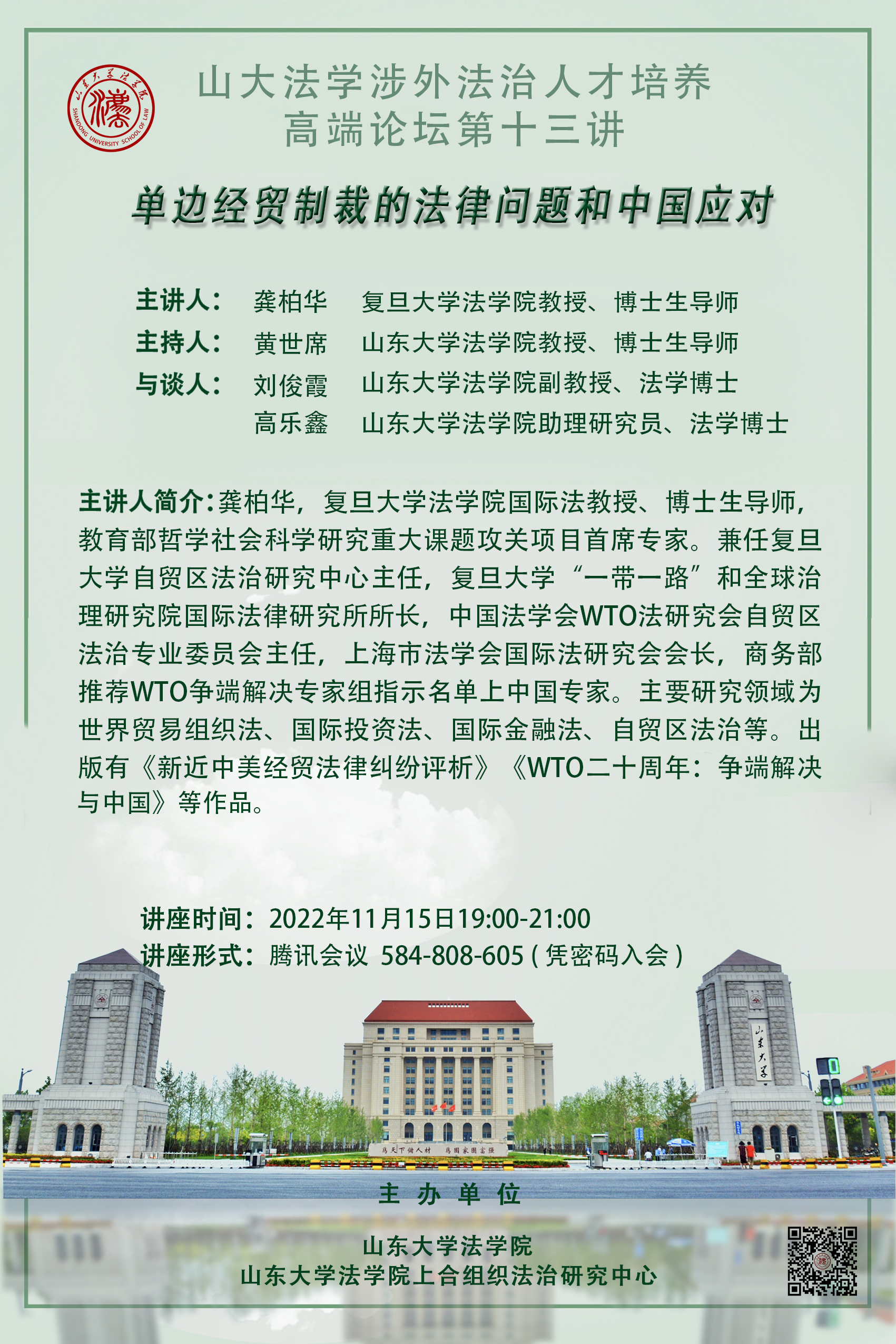讲座预告 | 555050注册大白菜涉外法治人才培养高端论坛第十三讲:单边经贸制裁的法律问题与中国应对