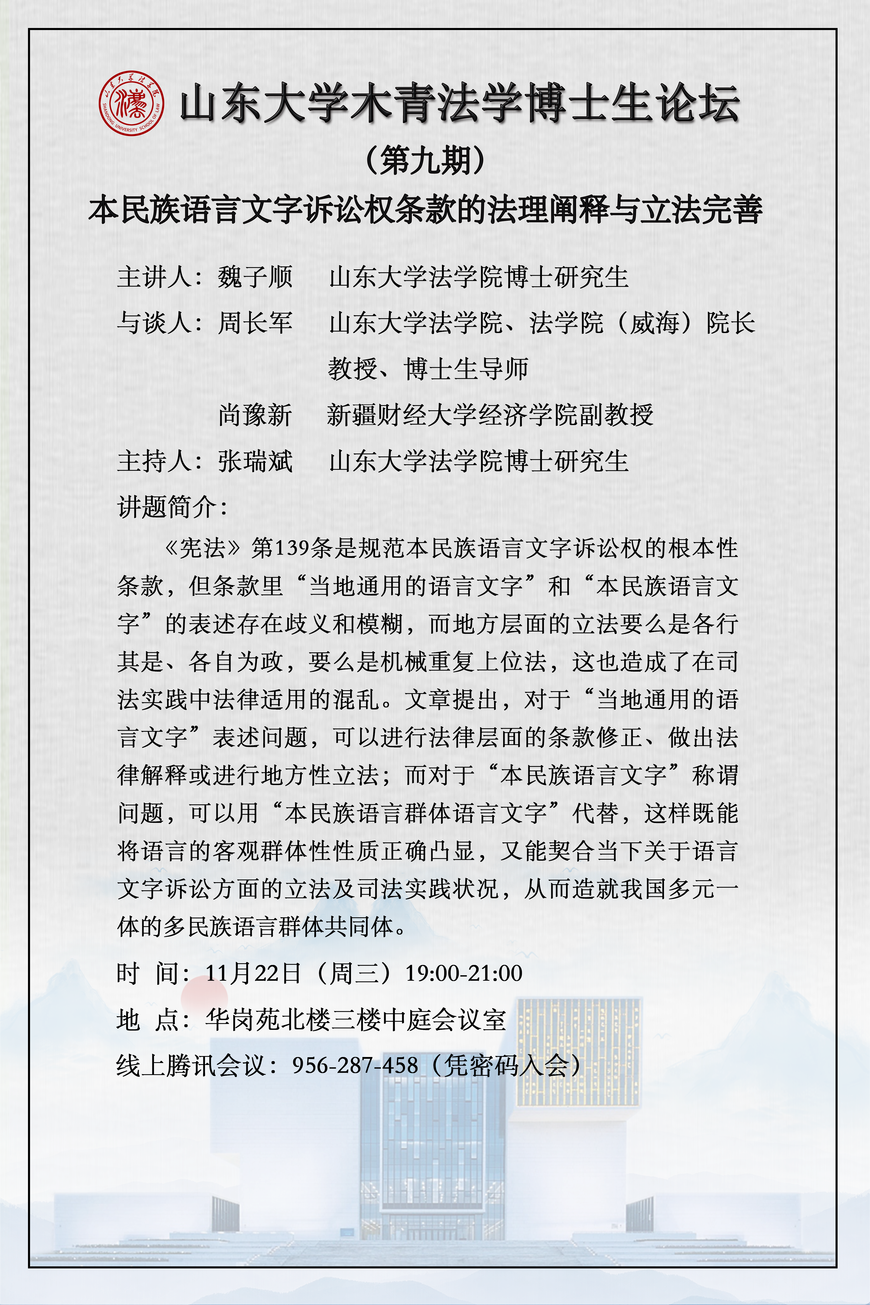 讲座预告 | 555050注册大白菜木青法学博士生论坛(第九期):本民族语言文字诉讼权条款的法理阐释与立法完善