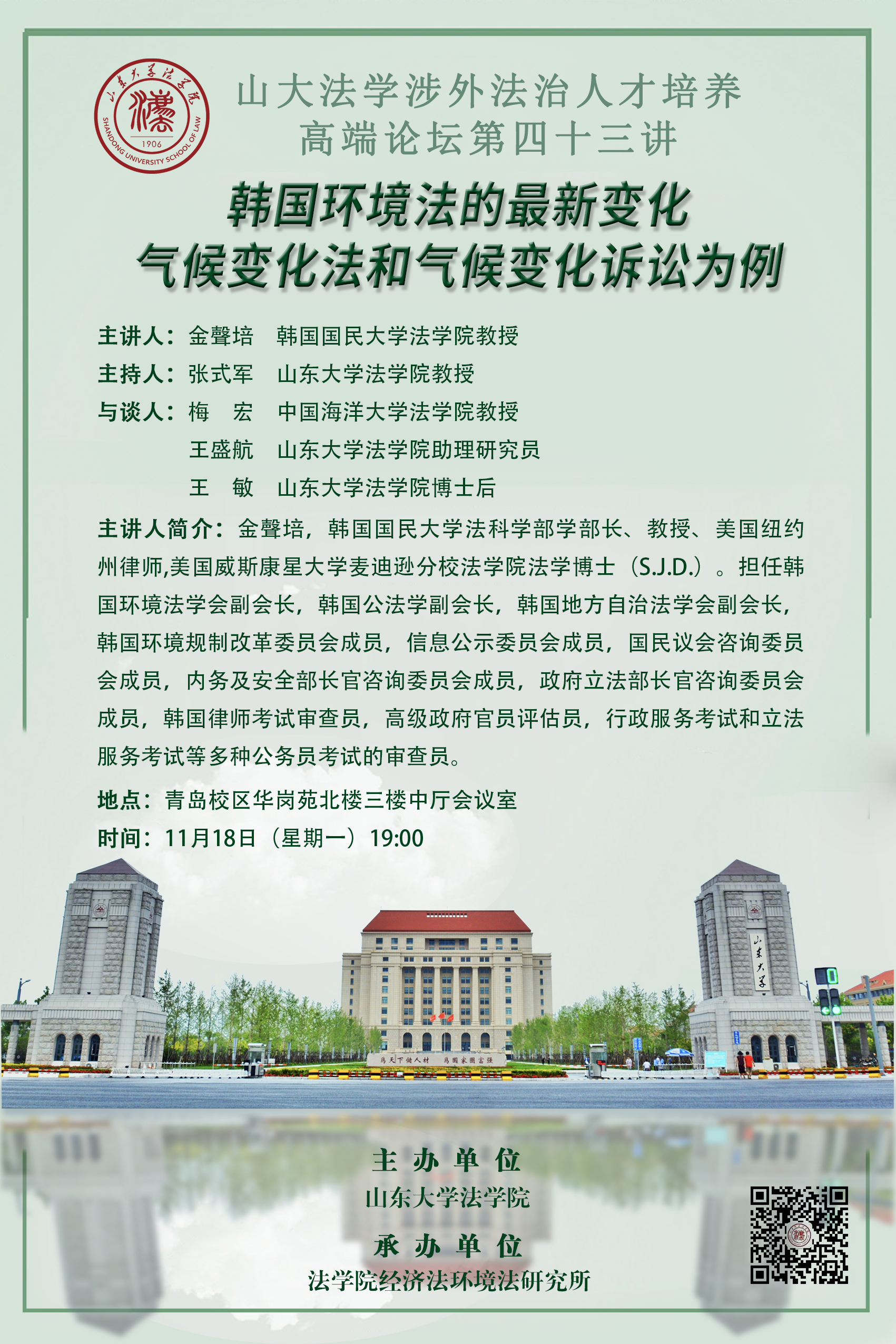 讲座预告 | 555050注册大白菜涉外法治人才培养高端论坛第四十三讲:韩国环境法的最新变化——气候变化法和气候变化诉讼为例