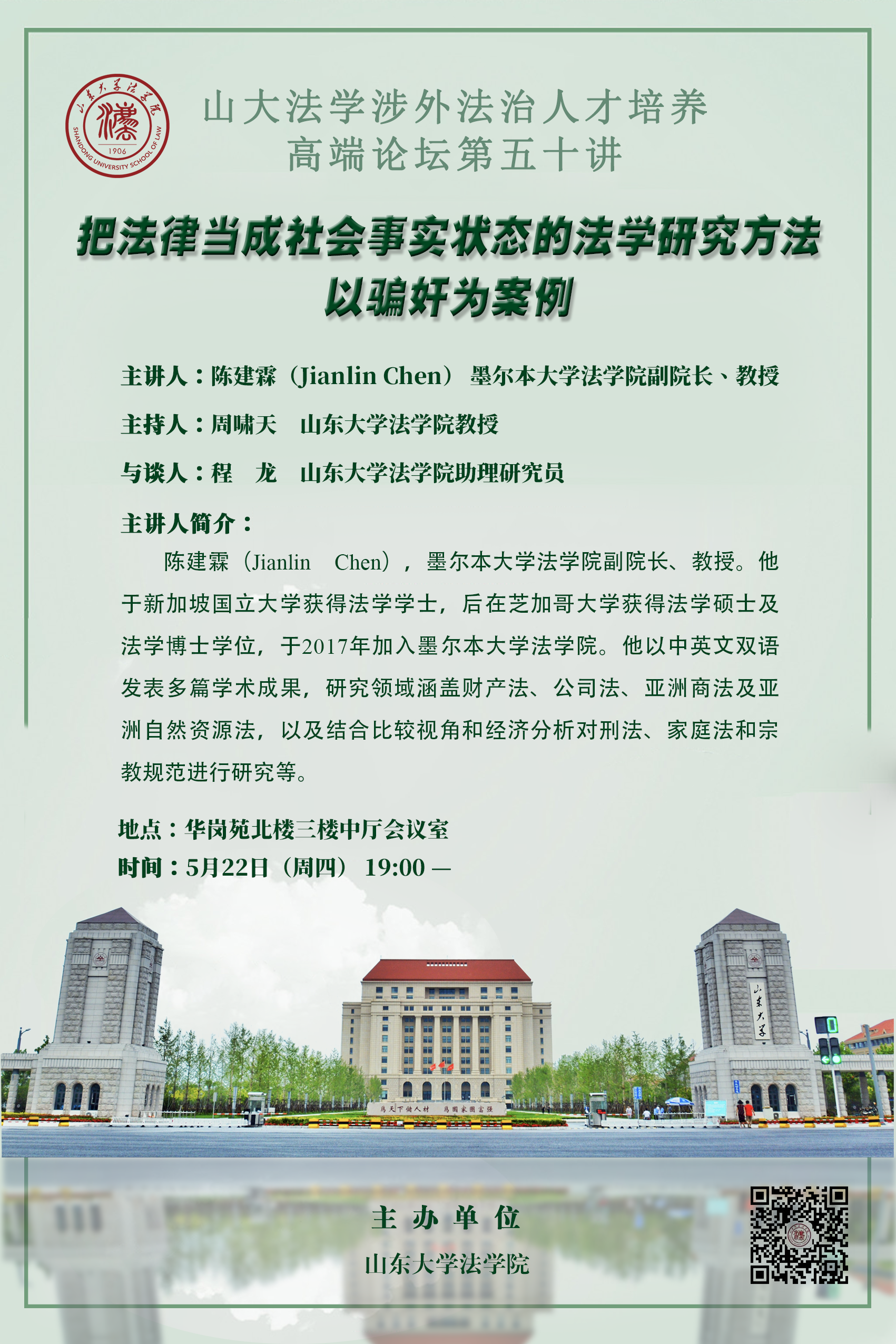 讲座预告 | 山大法学涉外法治人才培养高端论坛第五十讲:把法律当成社会事实状态的法学研究方法——以骗奸为案例