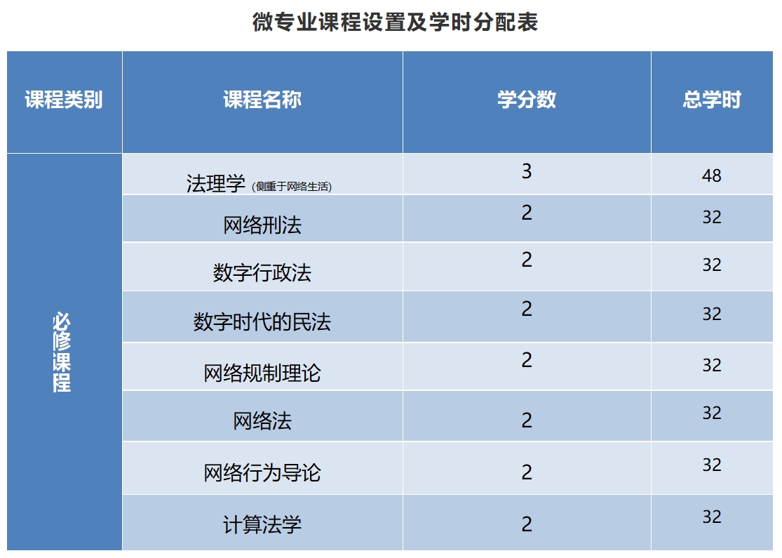 微专业共计17学分,课程设置注重法学与网络安全的交叉融合,核心课程主要包括:法理学(侧重于网络生活)、网络刑法、数字时代的民法、数字行政法、网络规制理论、网络法、网络行为导论、计算法学。
